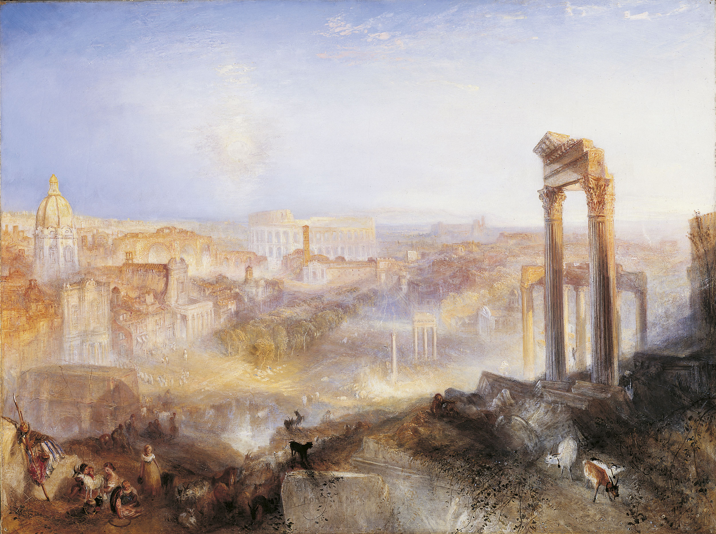 Nel 1819 Turner visita l’Italia per la seconda volta e soggiorna a Venezia, Roma e Napoli. Questo secondo e più approfondito incontro con il nostro paese segna fortemente la sua immaginazione e imprime una svolta decisiva al suo stile. Nascono gli splendidi acquerelli che raccontano la traversata delle Alpi e gli album di schizzi dove l’artista ha annotato paesaggi, edifici e figure di viaggiatori. Dall’esperienza di questo viaggio scaturiscono anche alcuni maestosi olii di grande formato realizzati dopo aver fatto ritorno in Inghilterra: sono spettacolari vedute di Roma ricolme dell’emozione provata dall’artista di fronte alle bellezze della città eterna.